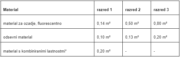 Oblačila različnih razredov morajo izpolnjevati minimalne zahteve glede količine materiala. Najmanjša površina, ki jo mora vsebovati oblačilo: