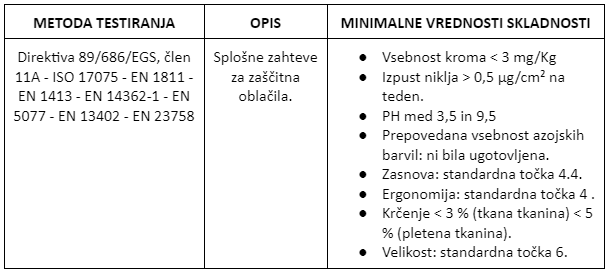 Izdelki iz našega prodajnega programa so izdelani, preizkušeni in certificirani v skladu z usklajenimi standardi iz uredbe o "OVO" (osebni varovalni opremi). Izdelki zagotavljajo zaščito in preprečevanje morebitnih nesreč ali poškodb pri delu v pogojih, ki vključujejo mraz, vročino, plamen, dež, zmanjšano vidljivost itd.